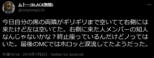 「今日自分の席の両隣がギリギリまで空いてて右側には来たけど左は空いてた。右側に来た人メンバーの知人なんじゃないかな?終始座っているんだけどノってはいた。最後のMCではホロっと涙流してたようだった。」