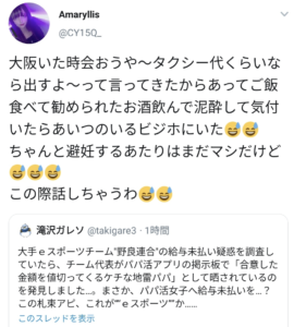 「大阪いた時会おうや〜タクシー代くらいなら出すよ〜って言ってきたからあってご飯食べて勧められたお酒飲んで泥酔して気付いたらあいつのいるビジホにいた。ちゃんと避妊するあたりはマシだけど。この際話しちゃうわ」引用:Twitter